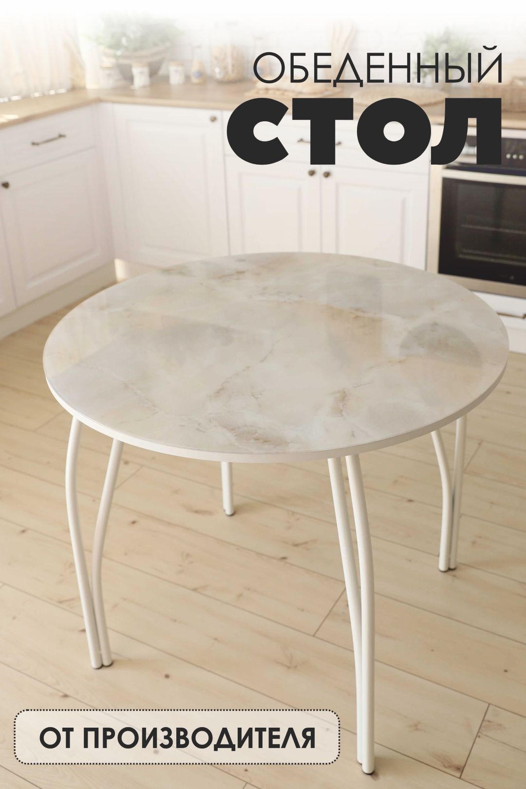 Круглый Обеденный стол с закалённым стеклом LEVINI Эмилия Бело-бежевый мрамор на белых ножках